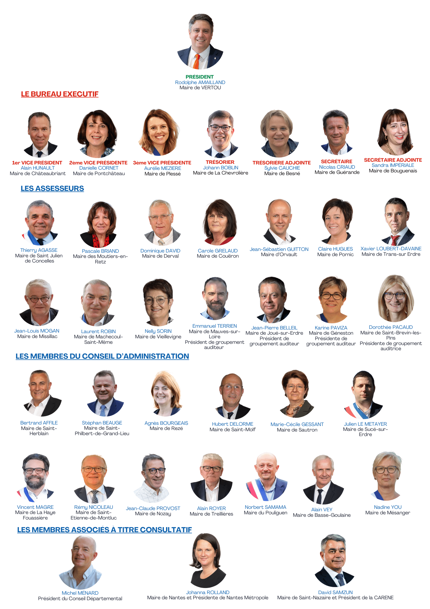 Il est composé de 38 membres élus sur une liste composée par les 6 groupements territoriaux. Il est représentatif des territoires du département. 3 membres sont associés à titre consultatif : Michel MENARD, Président du Département, Johanna ROLLAND, Maire de Nantes et Présidente de Nantes Métropole, ainsi que David SAMZUN, Maire de Saint Nazaire et Président de la CARENE.